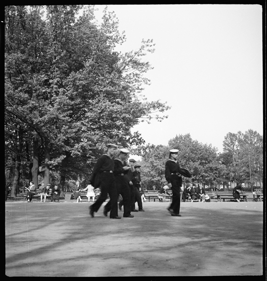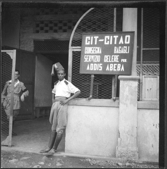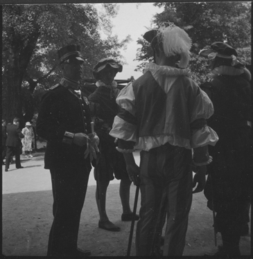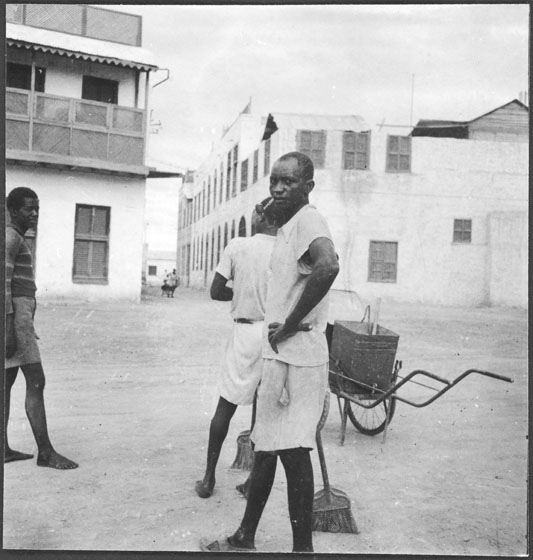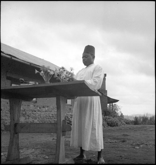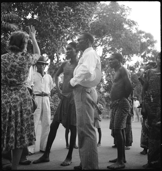![]() Leopoldville [Wort unterstrichen] Der Polizist im Village Indigène vermag es nicht länger, dem "Tam Tam" zu widerstehen u. beginnt zu tanzen... [handschriftlicher Eintrag auf Rückseite der Fotografie] |