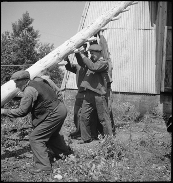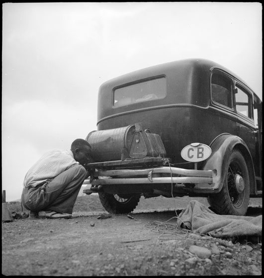 ![]() 3 [Zahl unterstrichen] Mit einem riesigen Wagenheber wird die Micheline gehoben - es zeigt sich, dass die Achse beschädigt ist. [handschriftlicher Eintrag auf Rückseite der Fotografie] |