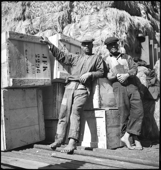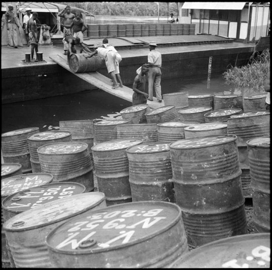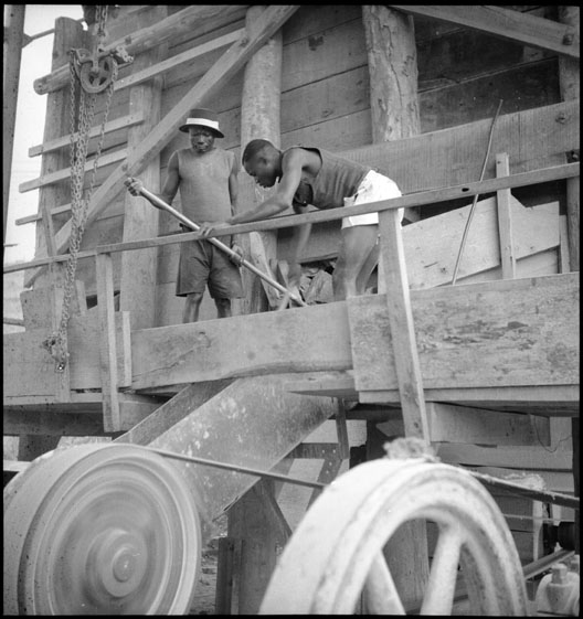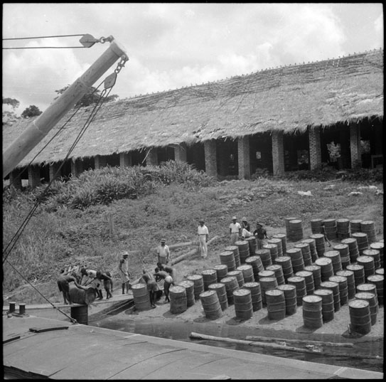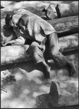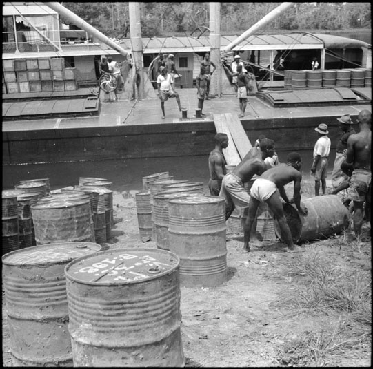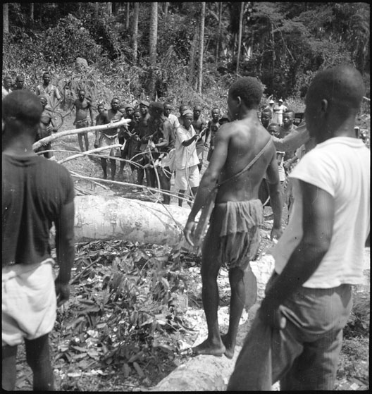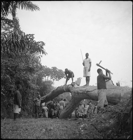 ![]() 5 [Zahl unterstrichen] Die Schwarzen arbeiten 6 Stunden, von 8 Uhr früh bis 2 Uhr mittags, in der dumpfen Hitze des Dschungels. [handschriftlicher Eintrag auf Rückseite der Fotografie] |