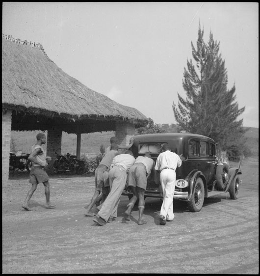 ![]() 6 [Zahl unterstrichen] Endlich sichert der weisse Mechaniker das Gleichgewicht des Wagens auf den Rädchen der provisor. Unterlage - und im 5 km.-Tempo wird der beschädigte Wagen bis zu einer 8 km entfernten Schienenzweigstelle geschoben - und die Fahrt kann im zweiten Wagen endlich weitergehen! (An der nächsten Haltestelle gab es dann sogar ein Bier!) [handschriftlicher Eintrag auf Rückseite der Fotografie] |
