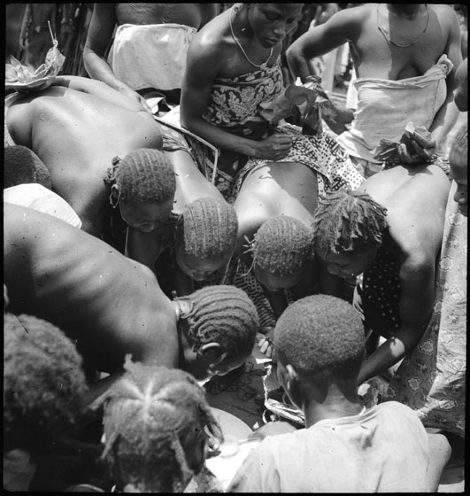 ![]() Leopoldville [Wort unterstrichen] "Tam-Tam" am Sonntag in dem den Eingeborenen angewiesenen Quartier - wo 40 000 Schwarze leben, während ganz Leopoldville nur 3500 Weisse zählt [handschriftlicher Eintrag auf Rückseite der Fotografie] |