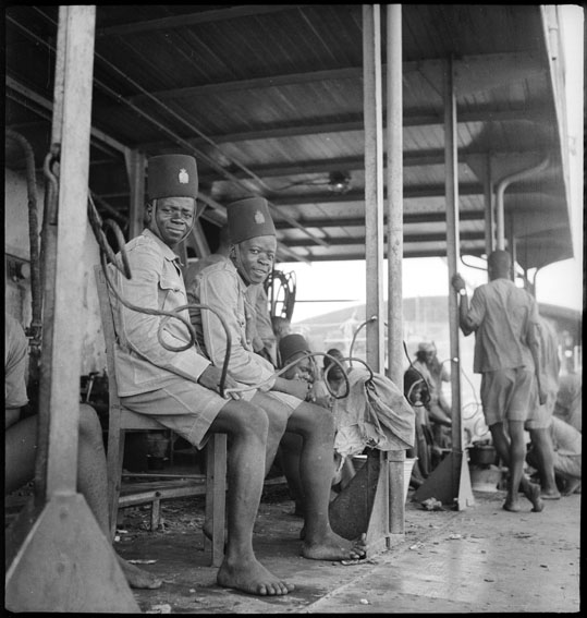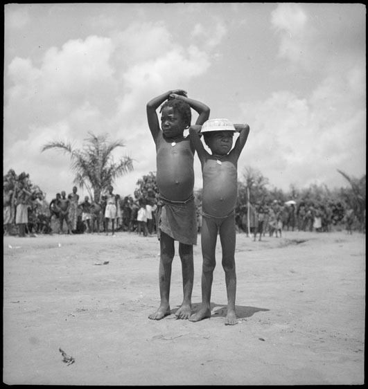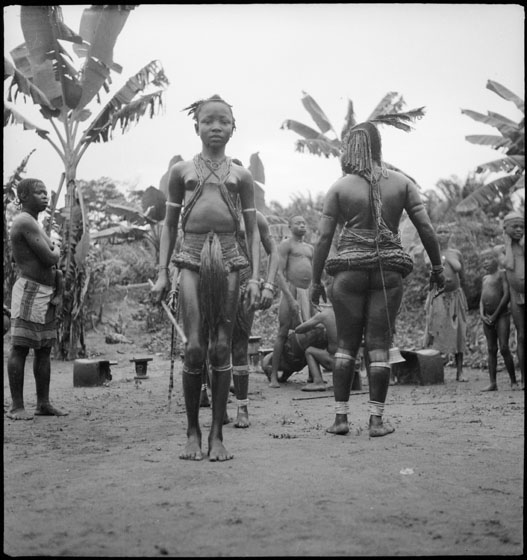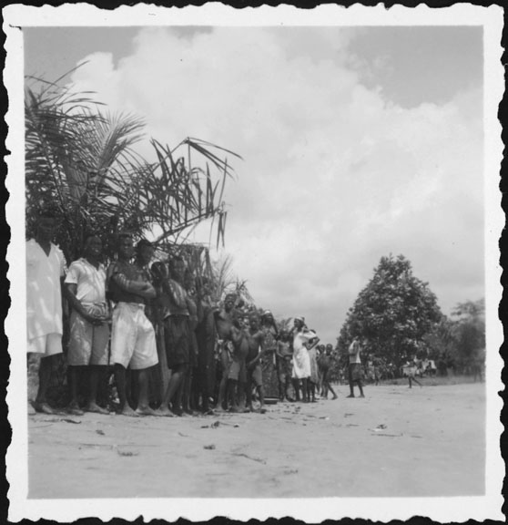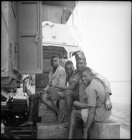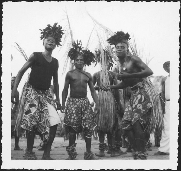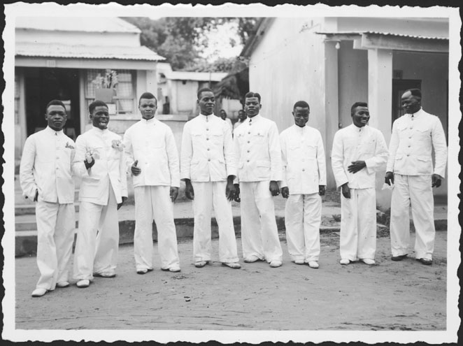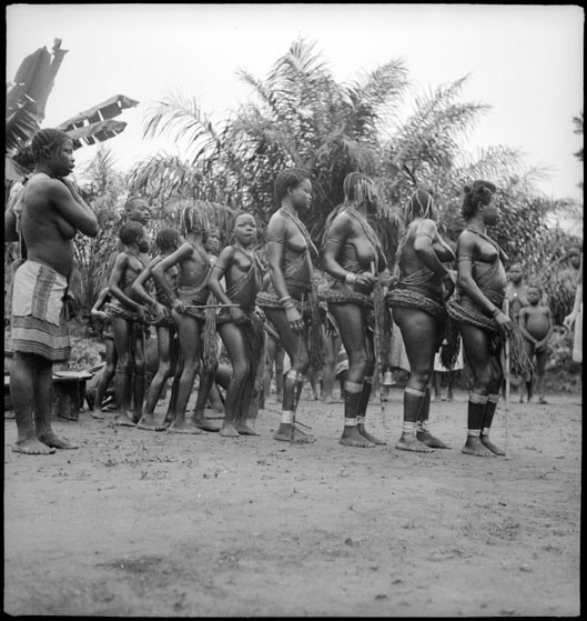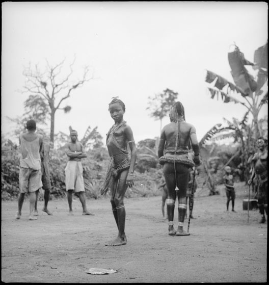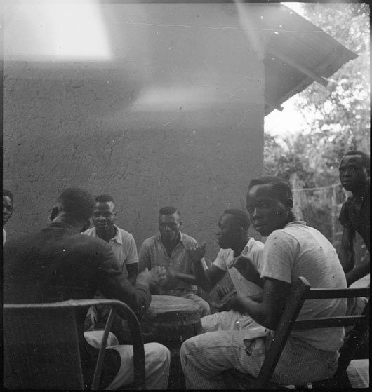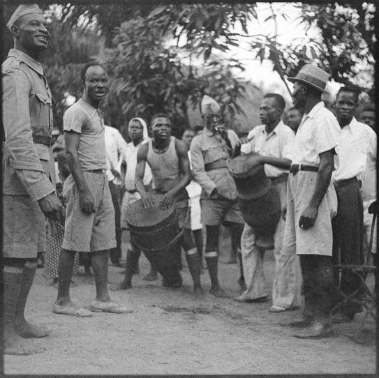 ![]() Leopoldville [Wort unterstrichen] Im Kreis um das "Tam-Tam" versammelt fangen die Schwarzen an zu singen u. zu klatschen - Es ist das primitive Stadium der Jazzkapelle [handschriftlicher Eintrag auf Rückseite der Fotografie] |