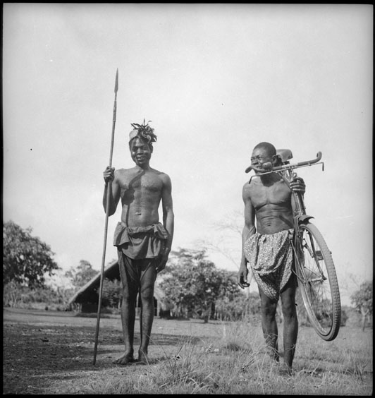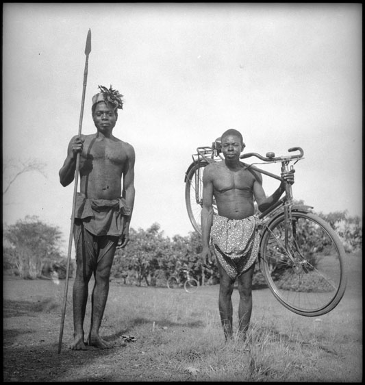 ![]() Azandé-Krieger nahe Faradjé (Anglo-Sudangrenze) mit Velo! [handschriftlicher Eintrag auf Karteikarte] |