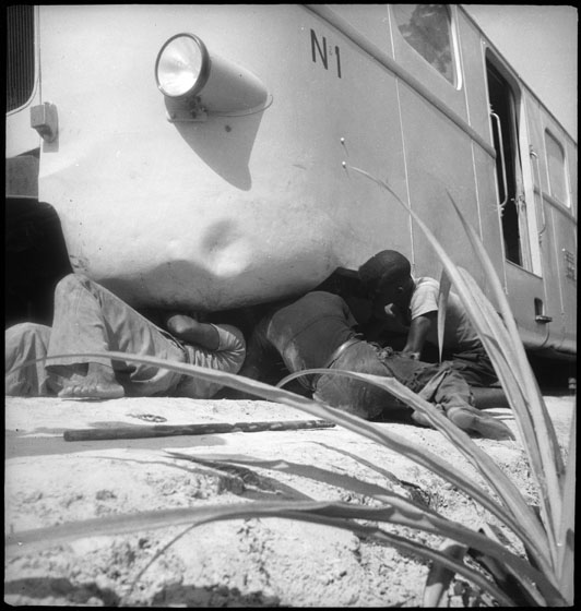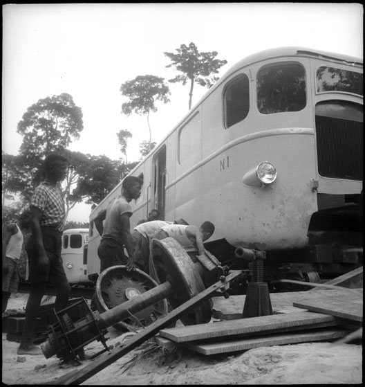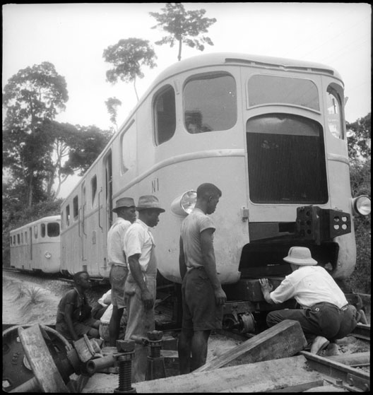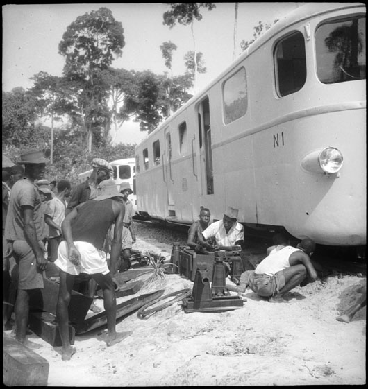 ![]() 1 [Zahl unterstrichen] Auf der ca. 500 km langen Strecke zw. dem französ. Kriegshafen Point Noir u. der Hauptstadt vom freien Französ. Equatorial Afrika, Brazzaville, verkehrt 2 x wöchentlich eine elektrische "Micheline" - die gewöhnlich ca 12 Std für den Weg braucht [handschriftlicher Eintrag auf Rückseite der Fotografie] |